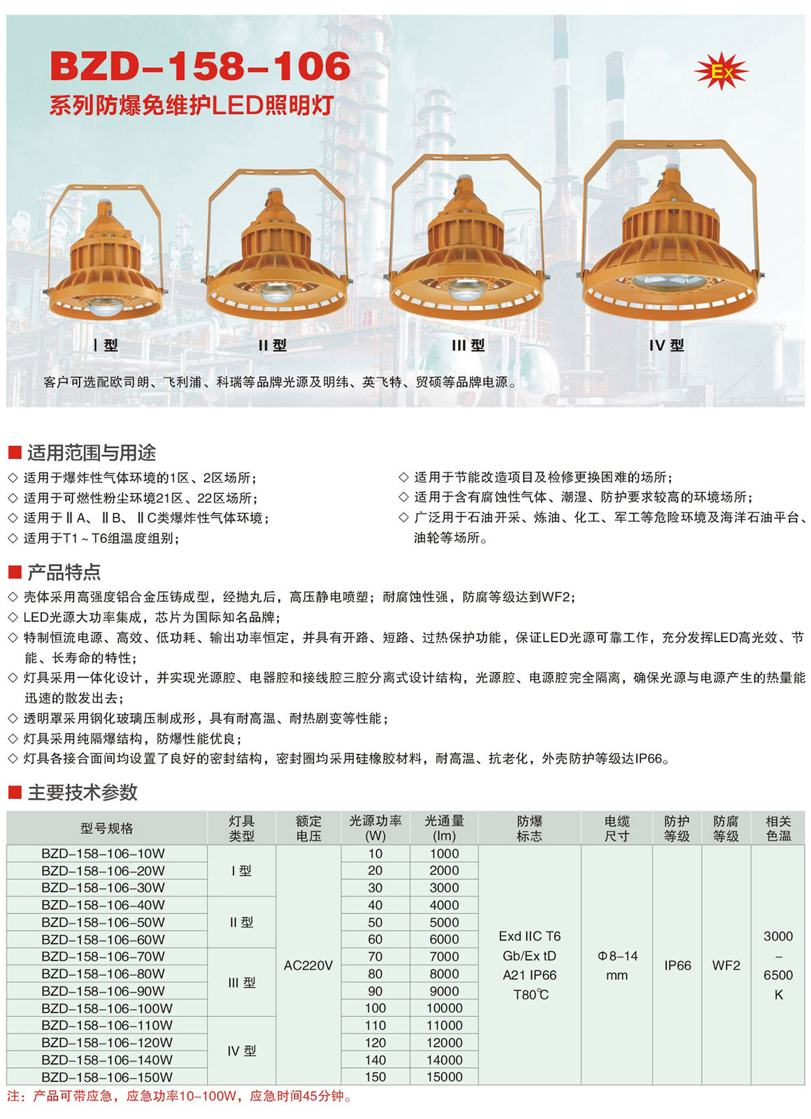 产品中心 LED防爆灯 BZD-158-106系列防爆免维护LED照明灯(ⅡC)